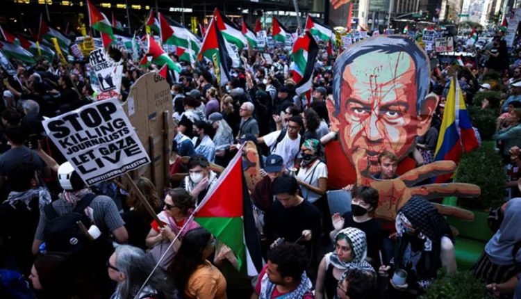نيتن ياهو جي خطاب دوران گڏيل قومن جي عمارت ٻاهران احجاج، اسرائيل تي پابندين جو مطالبو