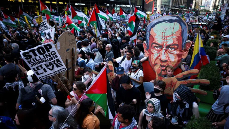گڏيل قومن جي جنرل اسيمبلي ۾ اسرائيلي وزيراعظم نيتن ياهو جي خطاب دوران گڏيل قومن جي عمارت ٻاهران وڏي انگ ۾ ماڻهن احتجاج رڪارڊ ڪرايو.